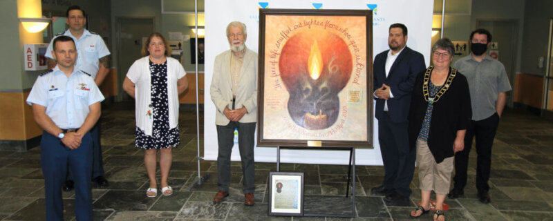 Forrestall’s painting is a beautiful image honouring the 22 Nova Scotians (and an unborn baby) who lost their lives in the tragic shooting on April 18 and 19, 2020 and the six crew members of the Canadian Forces who died in a helicopter crash in the Ionian Sea on April 28, 2020. Two extinguished candles sit below an eternal flame.