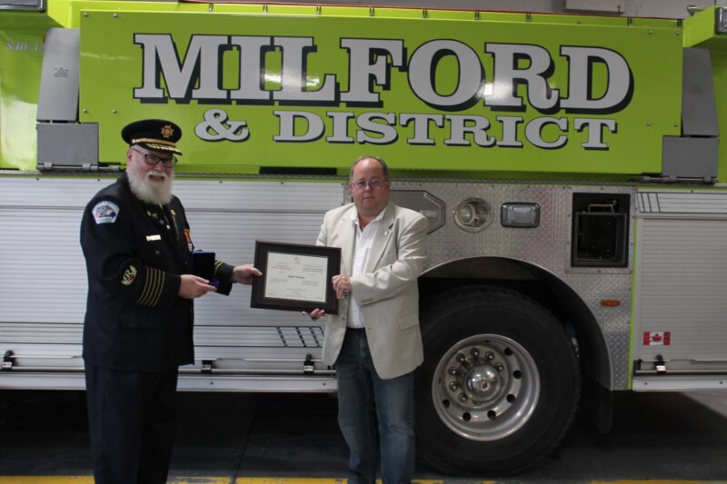 - – Chief Edward Moxsom has been with Milford VFD for 25 years. He was given his 20 years of service Governor General Exemplary Service award and his 25-year provincial long-service award, which he will receive at a later date.