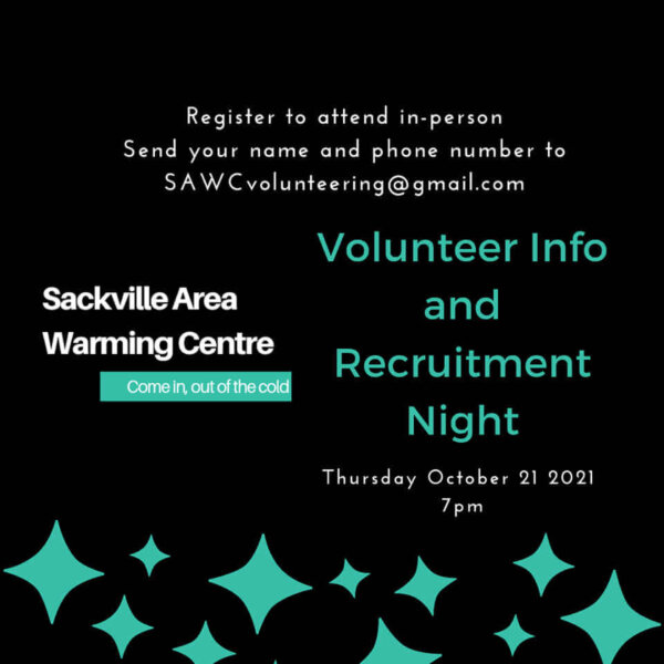 LOWER SACKVILLE: The Sackville Area Warming Center (SAWC) is holding a volunteer recruitment event next Thursday night Oct. 21 and is looking for a few good men and women to give up a few hours a week to help them out.