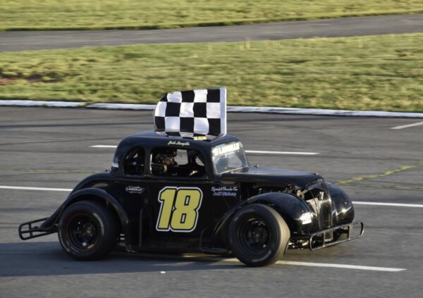 MAIN PHOTO: Josh Langille carries the heat race win checkered flag on the backstretch at Scotia Speedworld. He also won the feature. (Submitted photo)