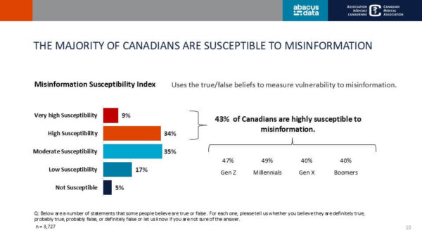 It found that 43% of Canadians are highly susceptible to believing misinformation, while another 35% are moderately susceptible.