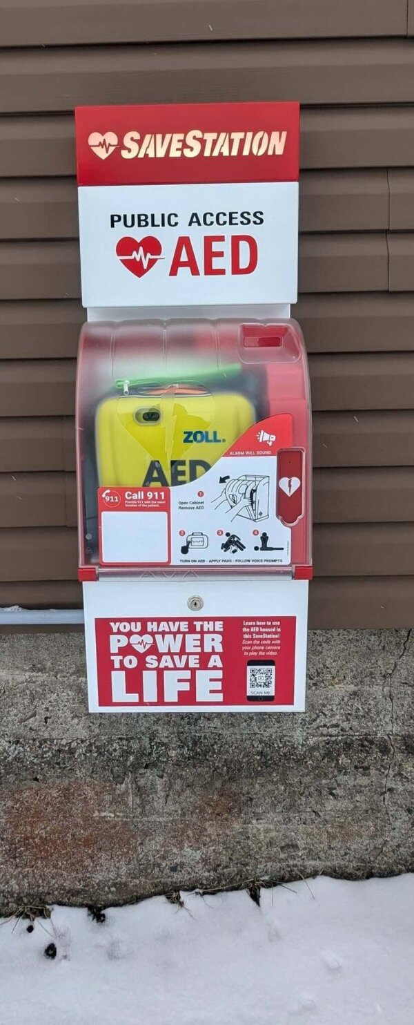 The AED defibrillator is mounted outside for quick access in an emergency lifesaving situation.