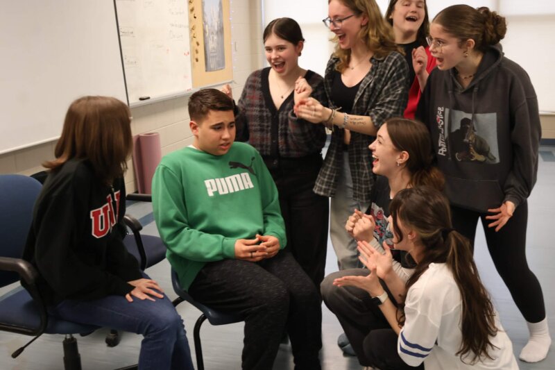 The students were practicing one of the big scenes for the production, which hits the stage April 30, May 1, and May 2.