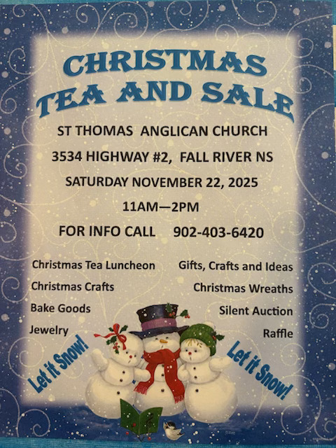 The tea and sale will take place Nov. 22 at the St. Thomas Anglican Church, located at 3534 Hwy 2 in Fall River. It will run from 11 a.m. to 2 p.m.