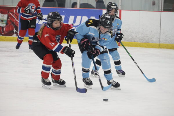 A Valley Wild player (blue jersey) skates up the ice and away from a defender with Metro Wets Force Blue (red jersey) during Force Cup action in Bedford. (Healey photo)