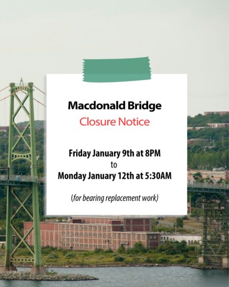 The Macdonald Bridge will be closed to vehicle traffic this upcoming weekend from Friday, Jan 9 at 8 PM until Monday, Jan 12 at 5:30AM.