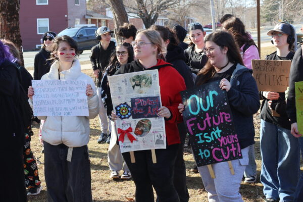 Many carried signs highlighting their concerns with the cuts. After gathering at the park, the group walked along the sidewalk between the Snow Centre and Highway 2 near the traffic lights.