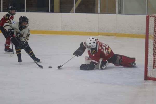 A Sackville Blue player reaches out to get the puck as two Penguin look on in U9 play. (Healey photo)