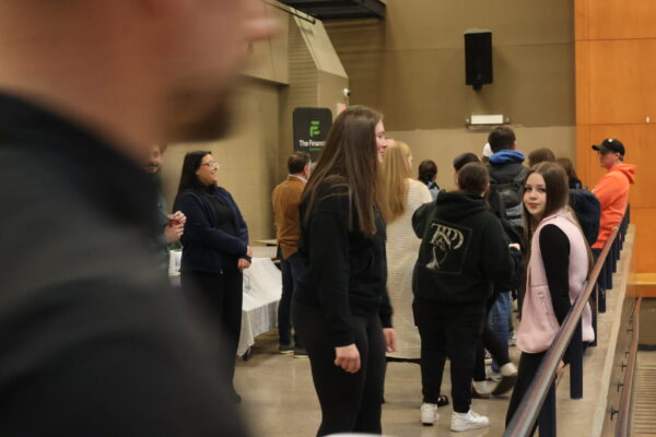 Students look over the list of booths while others ask questions at the Gerald Mitchell Contracting booth. (Healey photo)
